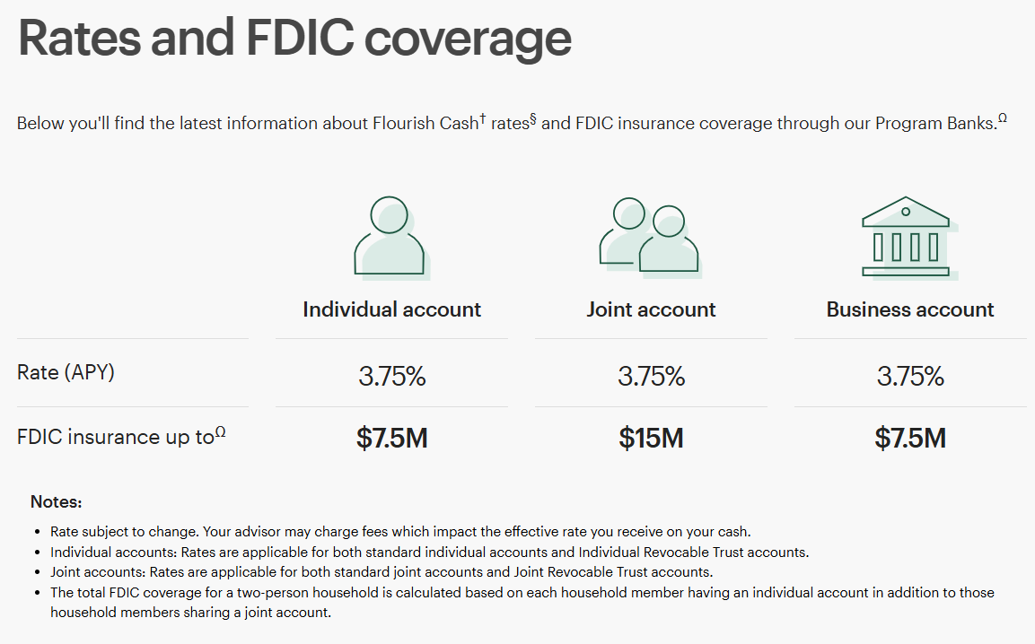 Flourish is an invitation-only cash account offering rates up to 10x the national savings account average and 12x the FDIC insurance coverage of a single bank account designed exclusively for the clients of independent financial advisors. Squire offers this to anyone, including those who are not a current client.
