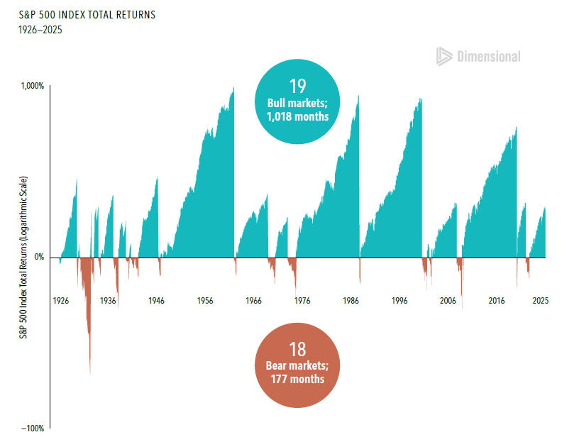 • From 1926 through 2025, the S&P 500 Index experienced 18 bear markets, or a fall of at least 20% from a previous peak, ranging from —21% to —80% across an average length of 10 months.