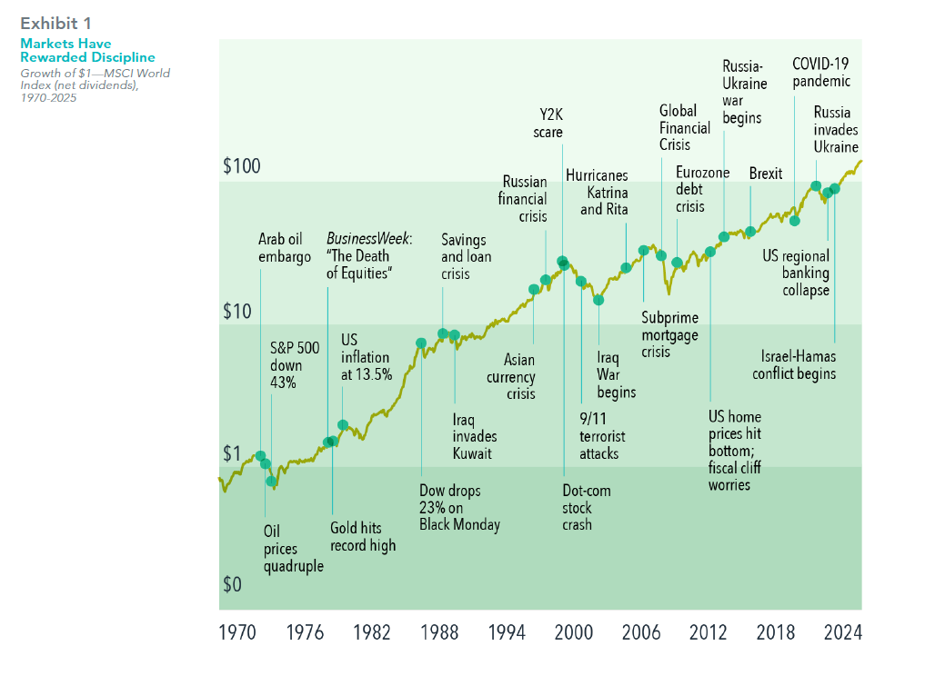 This is born out in historical stock returns. Global equity markets have continued an upward climb even in the face of economic and political upheavals. We don’t have to look far for illustrative examples. During the past few years, stock markets have had positive returns despite multiple wars being fought around the world.