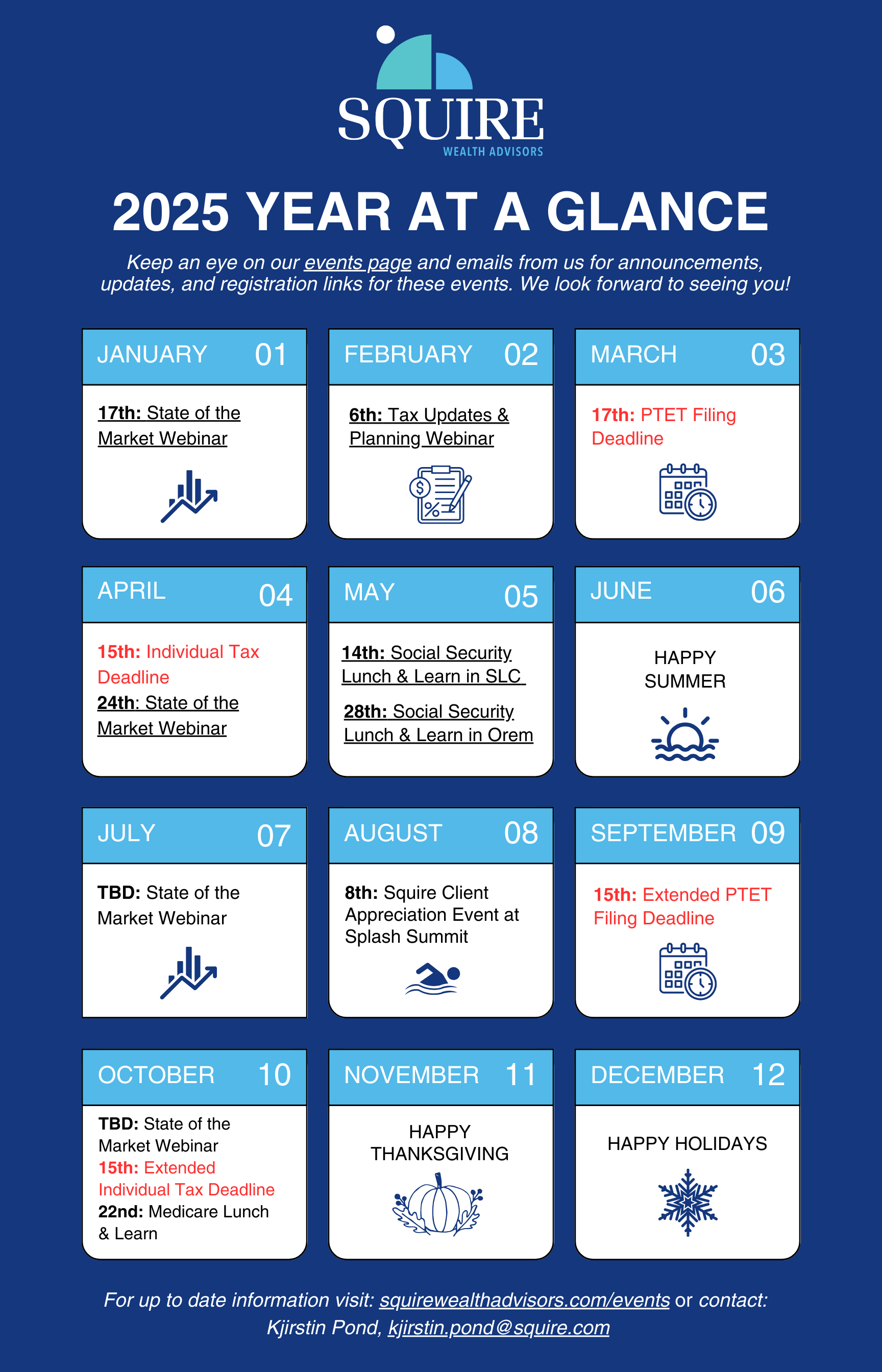 Year-at-a-Glance Check out Squire Wealth Advisors' plans for the upcoming year. We hope you'll join us.Wealth Year at a Glance